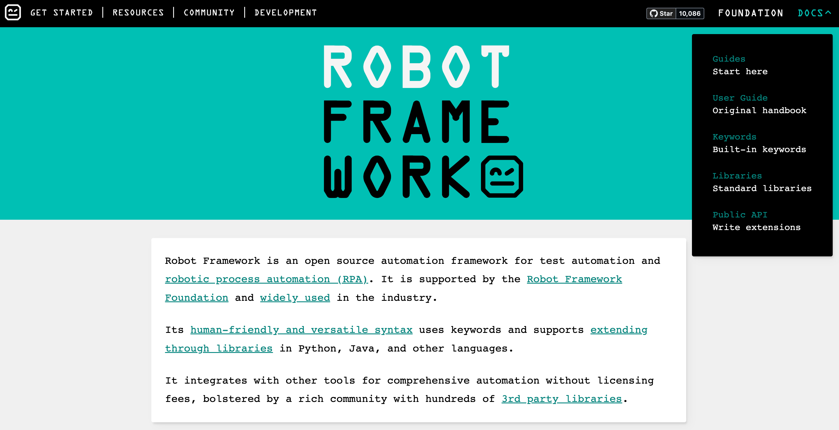 - Rich Ecosystem of libraries. For example, you can integrate SeleniumLibrary for web testing, DatabaseLibrary for database testing.