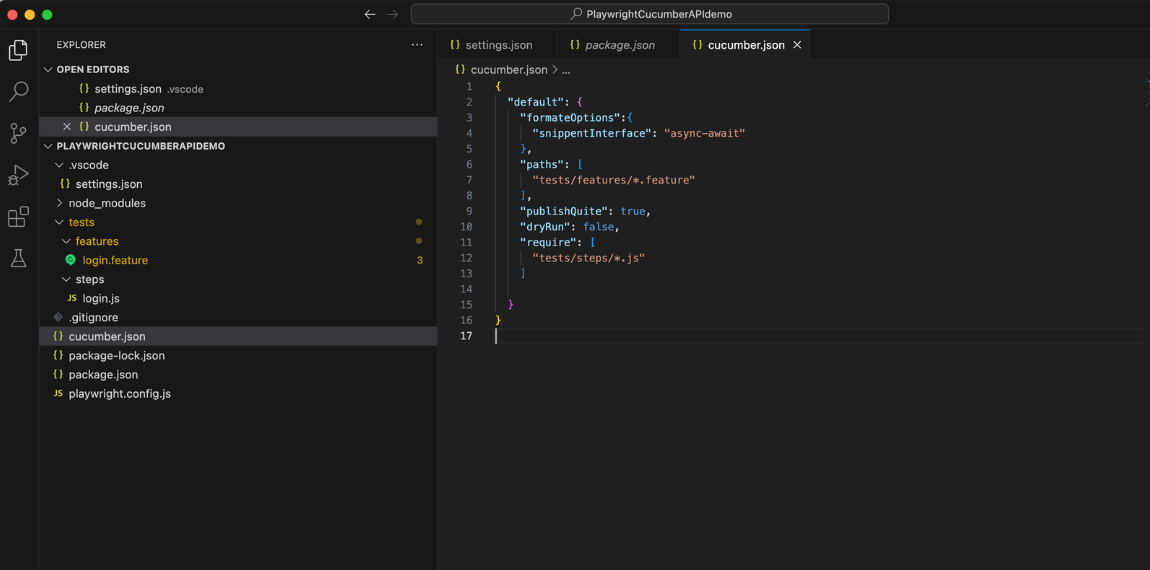 At this step, you can create a directory called step_definitions and add a JavaScript file (for example, login.js) Similarly, look at the structure of the file tree on top.