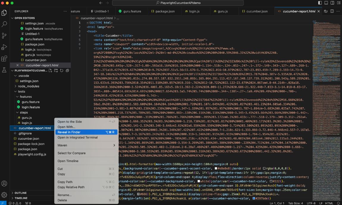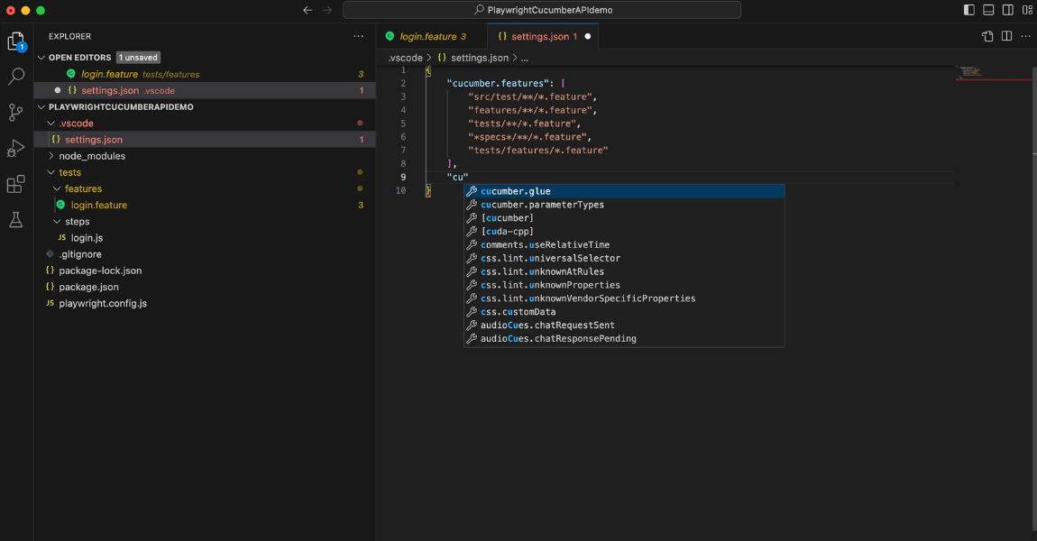 We have to create a feature folder and add our file to insert this code. After that add the path to this file and the steps file in vs.code =>settings.json Refer to the screenshot below for guidance: