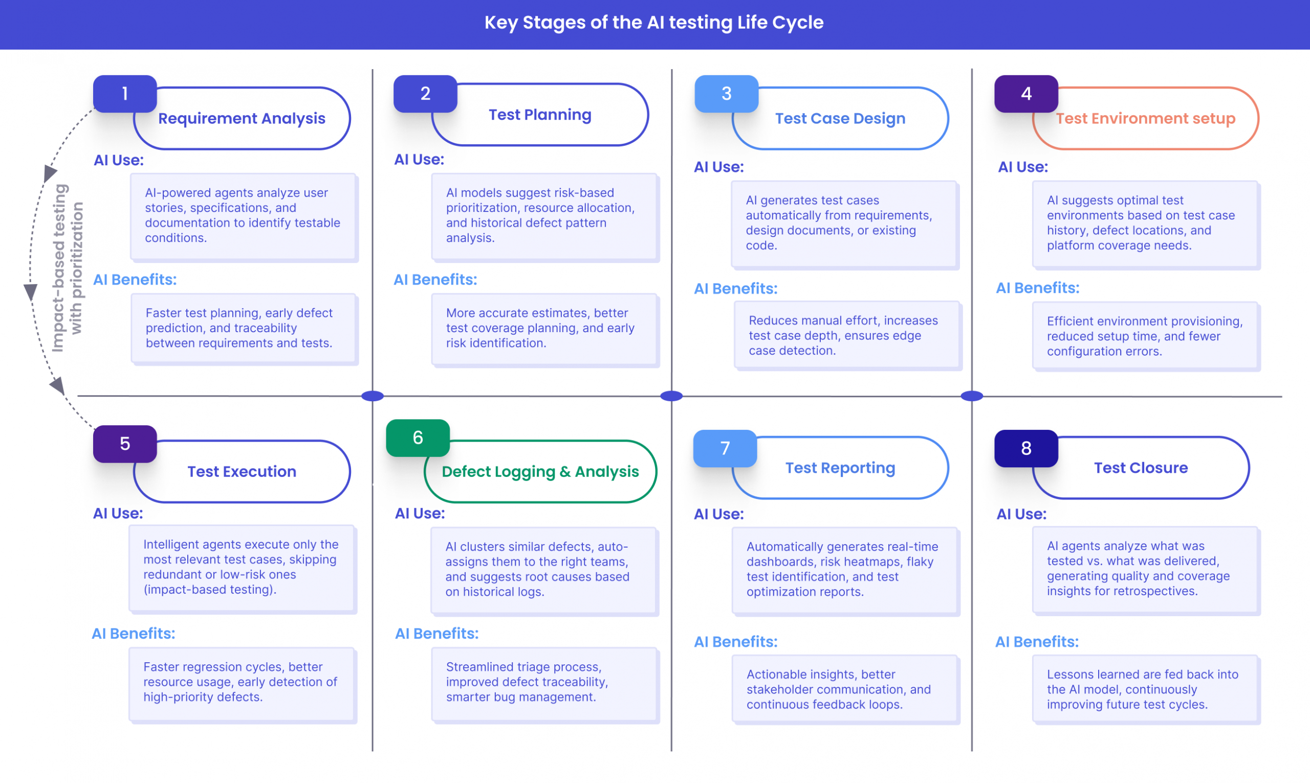 Artificial intelligence can be integrated into the key stages of the testing lifecycle – planning, design, execution, and optimisation. Below, you can find more information about each stage: