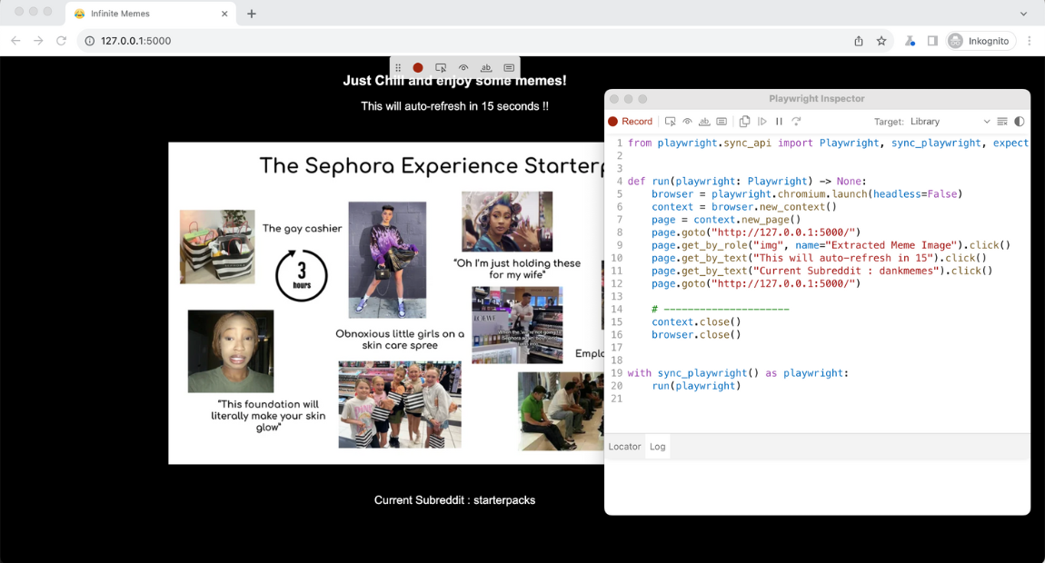 This test is quite simple, but it already allows us to see how Playwright works. For example, we open our URL, but the test expects <title> Infinite meme, we got the error, as in truth it is Infinite Memes. If rewrite our testing framework in Playwright it looks like below: