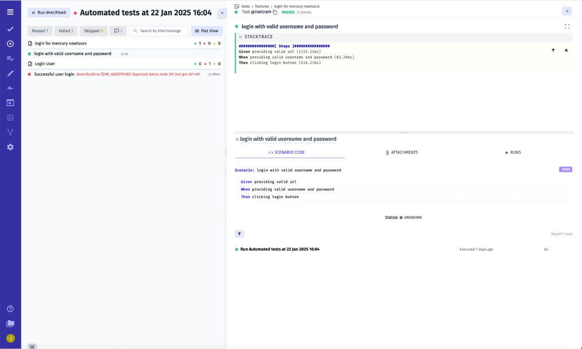 GivenactionsWhenand expected resultsThen, ensuring a shared understanding of requirements. Here’s an example of the structure of a simple feature file written in Gherkin syntax: - Automate feature file within steps definition. This file acts as an automation script that interacts with the software to check its behavior. During execution, each step defined in the feature file is carried out in the step file. You can either integrate existing automation scripts into testomat.io or develop new ones. This enables the automatic execution of test scenarios to ensure the software’s behavior is correct. All of them are initially generated with a skeleton structure by the command line prompt, containing exceptions for non-existing implementations, ensuring that tests fail until implementation. Then, methods for each step are developed to interact with the software. Assertions are added to verify the validity criteria of the scenario to confirm the correctness of the system’s behavior.