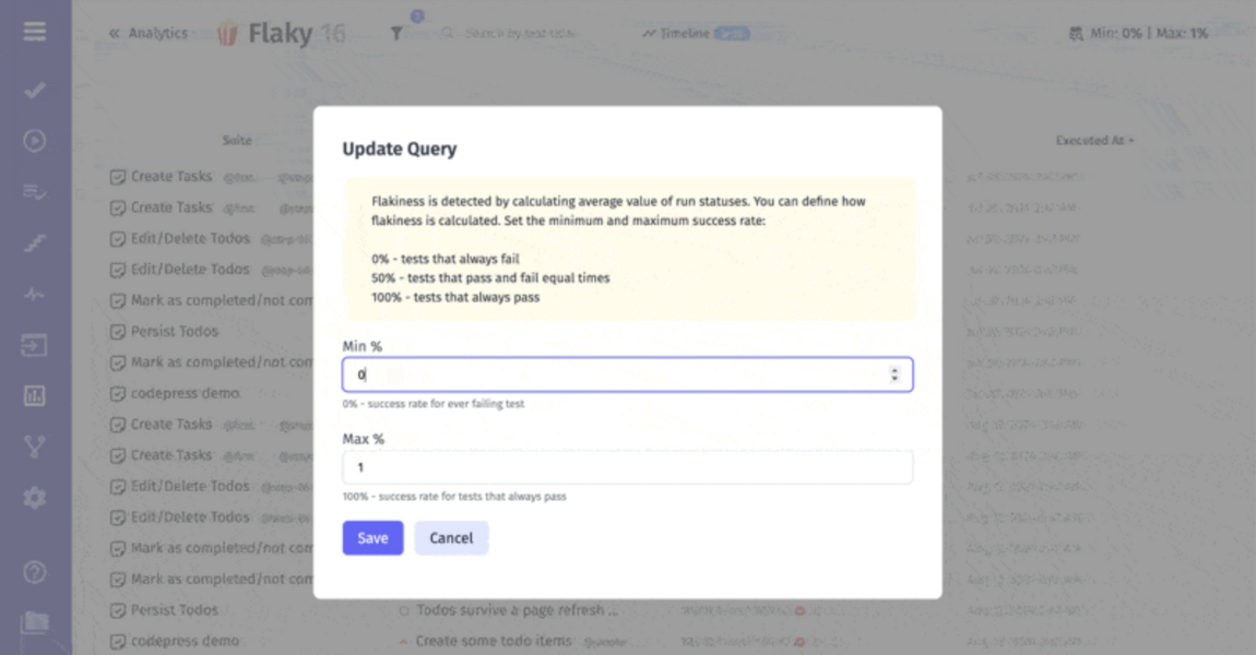 - Analyzing test run history. Review the test execution history in your CI\CD pipeline or version control system. This will help identify the number of tests that periodically change their pass/fail status regardless of code modifications.