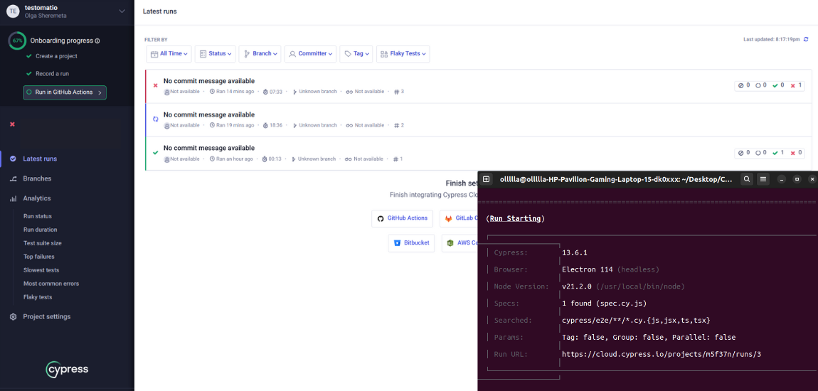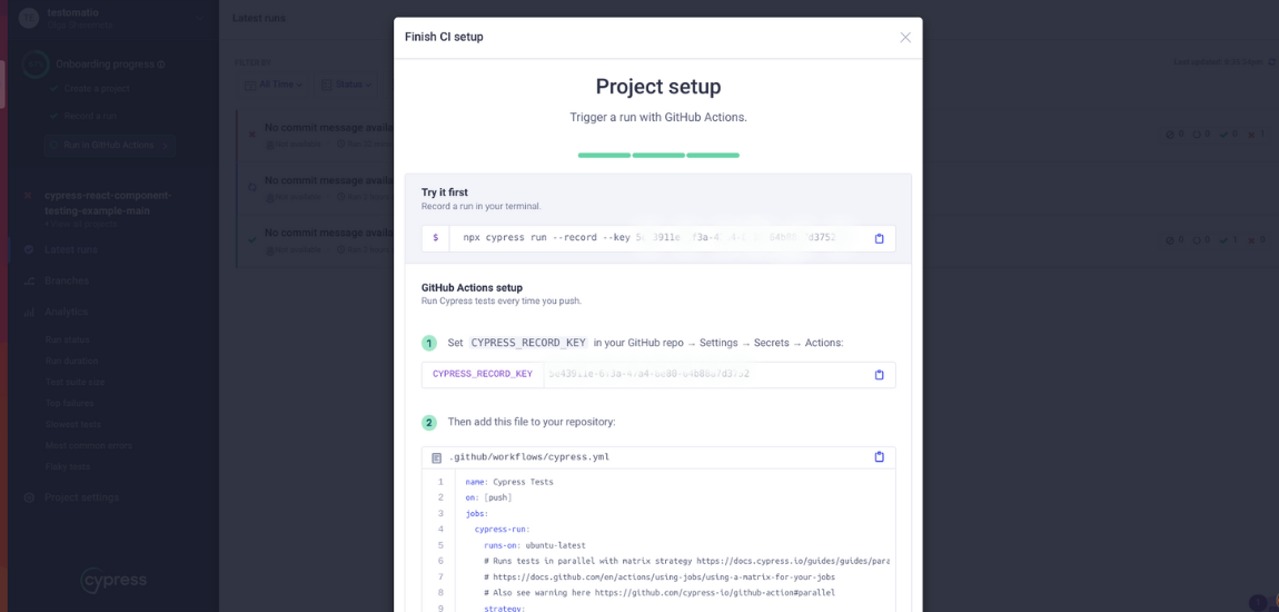 Of course, that depending on your CI provider, you may need a specific configuration file. Information about the required file and its installation can be found in such tips. After setting up testing in the CI pipeline, Cypress will record tests and save test results in the Cypress Dashboard.