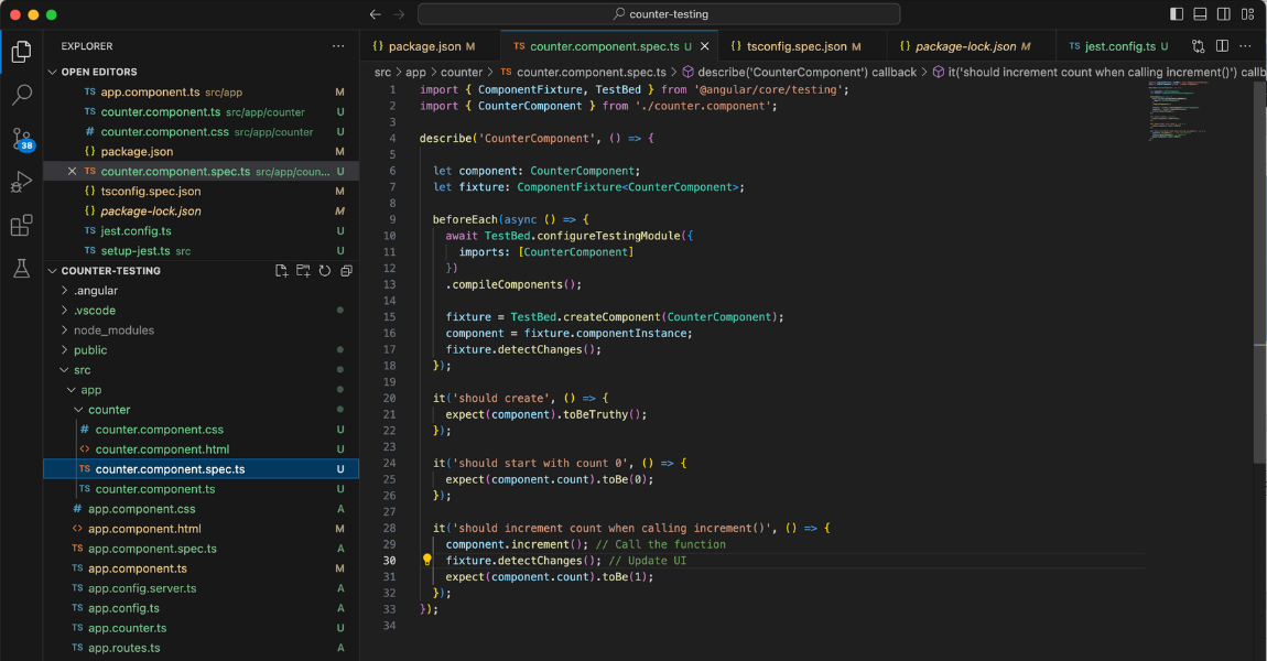 The entity where we implement Jest Angular component unit testing is the name.component.spec.ts and obviously our runner looking for the file in such format. Here are a few examples of the first test in Jest(test suite) for a simple Angular counter App: