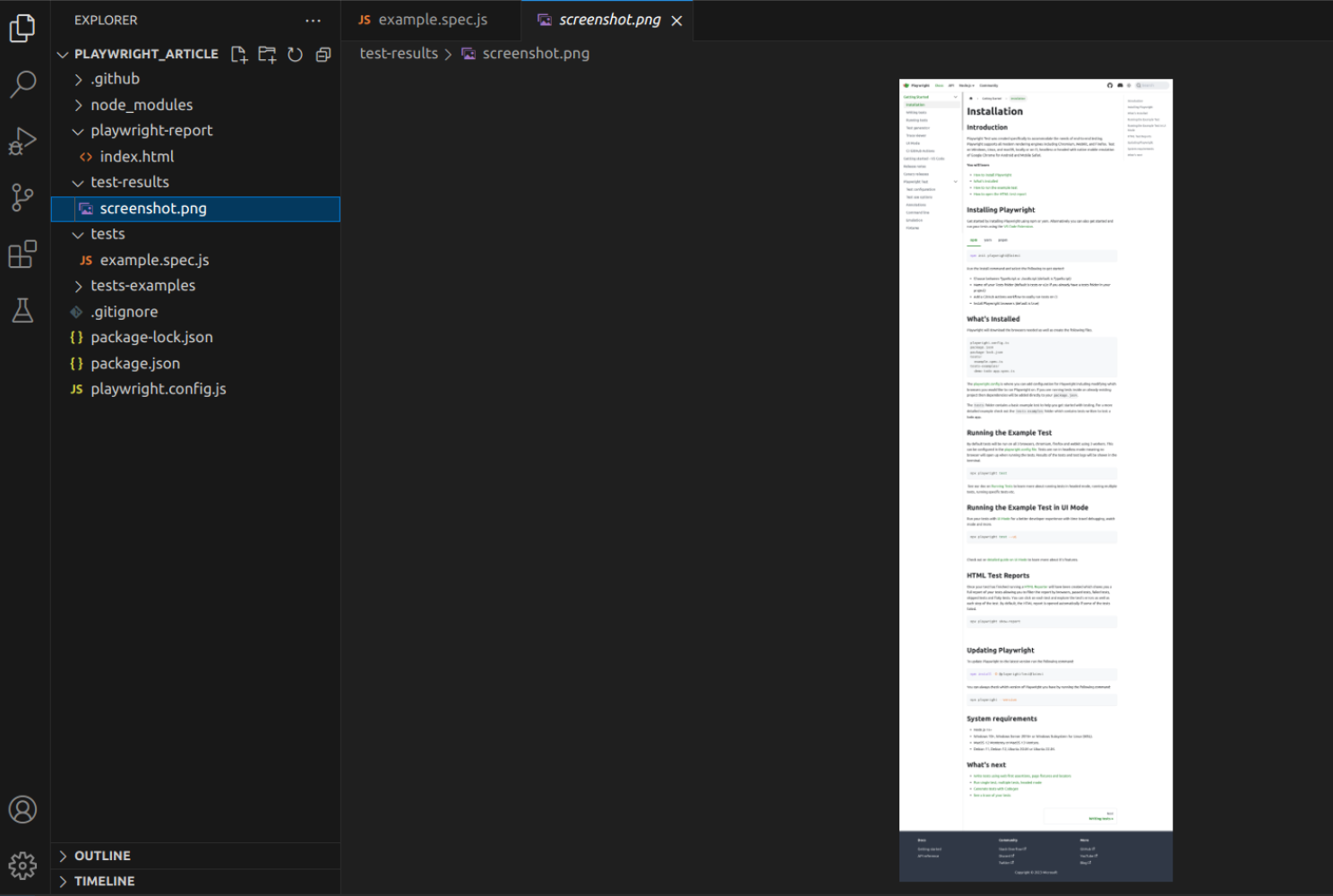 At first, have take a look at an Playwright example screenshot based on a initial JavaScript Demo Project. If you can see in it, to take a screenshot in Playwright, you should use the screenshot method, applying options like the screenshot specified path, full page capture, image format and saving it as screenshot.png in the appropriate directory: