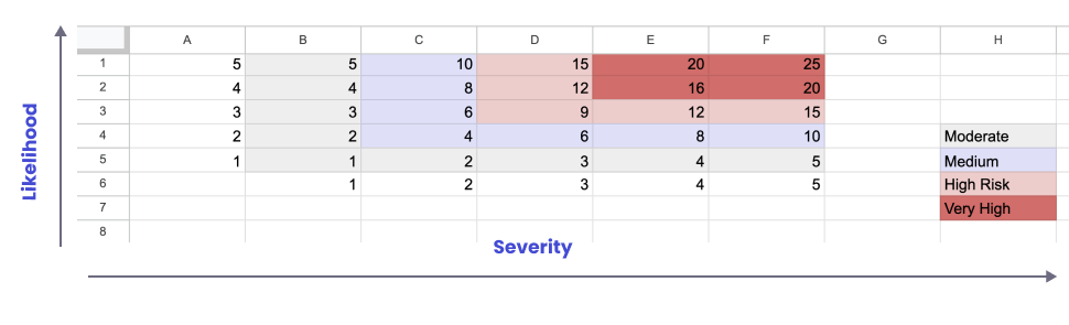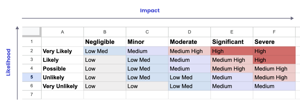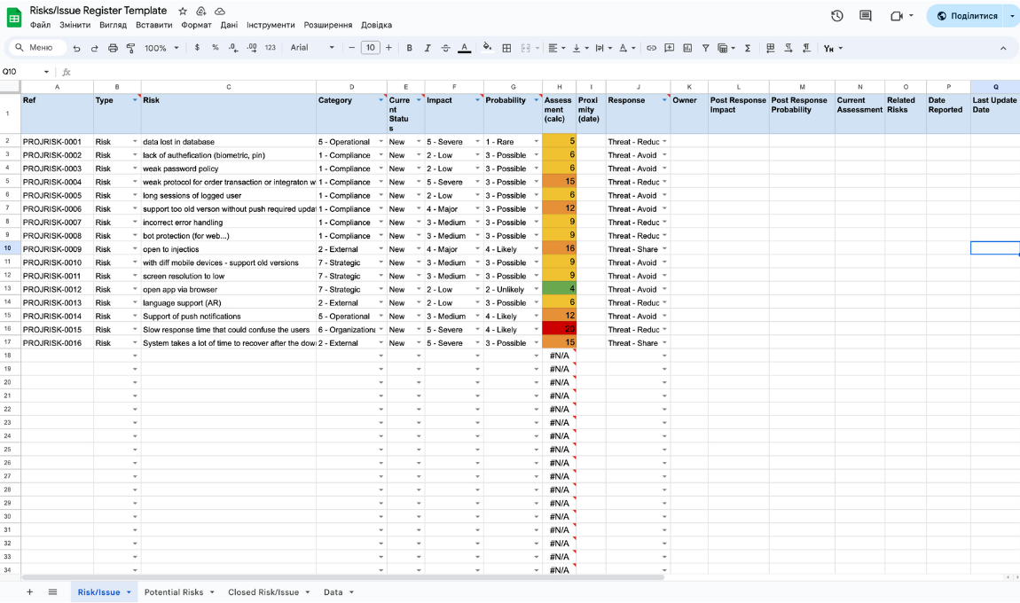 To build a risk matrix, you can use Google Sheets. In this case, the matrix will take the form of a regular table where each risk is assigned a coefficient based on its likelihood and impact: