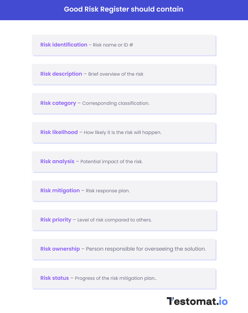 🔴 Please note: Risk registers are often ineffective because teams write them for specific tasks but attempt to use them across different projects. However, you should understand that risks vary from project to project, and most importantly, their impact and probability change.