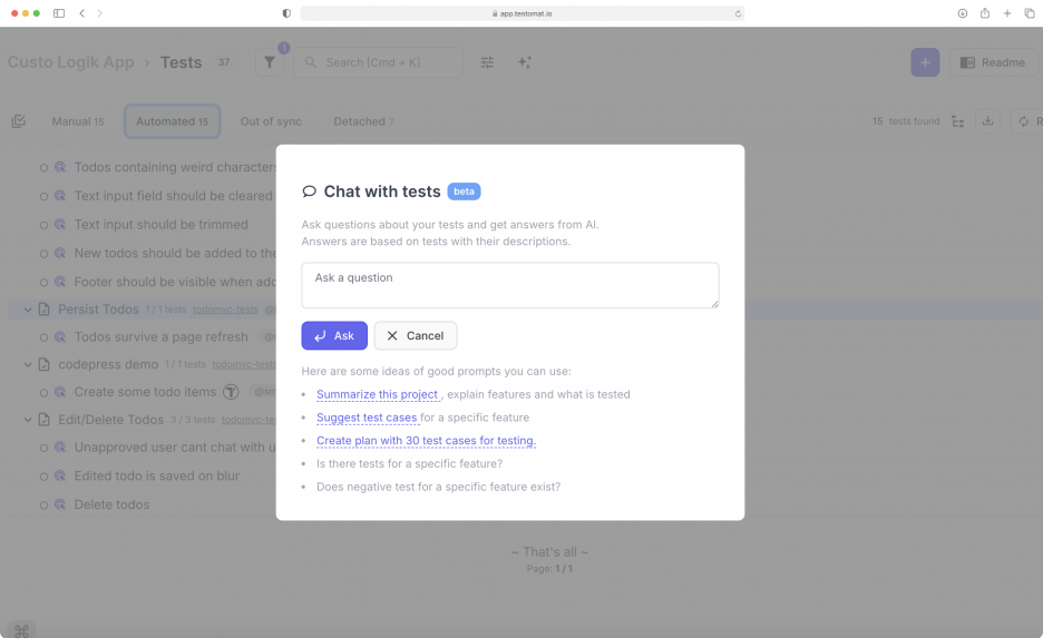 Chat with Tests is a special feature that allows you to retrieve any relevant information about the software you are testing. Our AI assistant lies within the project’s environment, providing exact, real answers on a specific topic. This eliminates uncertainty, filters out vague information, and simplifies research.